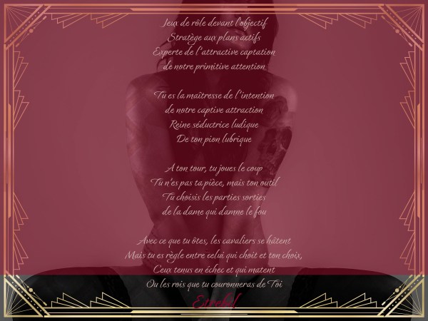 Jeux de rôle devant l'objectif, Stratège aux plans actifs, Experte de l’attractive captation, de notre primitive attention Tu es la maîtresse de l’intention de notre captive attraction Reine séductrice ludique De ton pion lubrique A ton tour, tu joues le coup Tu n’es pas ta pièce, mais ton outil Tu choisis les parties sorties de... Lire la Suite →